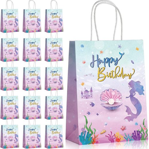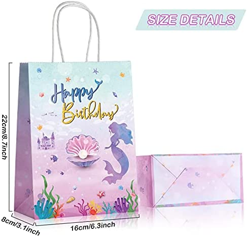 16 Pieces Mermaid Party Favor Bags Paper Girls Birthday Present Bag Goodie Candy Treat Bags with Handles Little Mermaid Themed Party Supplies for Birthday Baby Shower