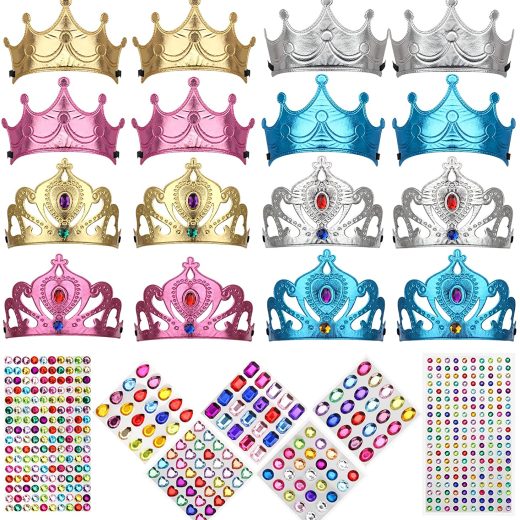 16 Pieces Foam Princess Tiaras and Crowns Making Your Own Tiaras with Crystal Diamond Sticker Princess King Crown for Kids