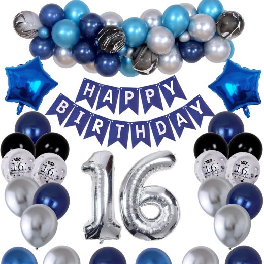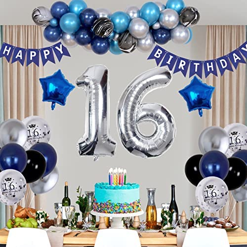 16th Birthday Decorations for Boys and Girls Dark Blue, HAPPY BIRTHDAY Banner Silver Number 16 Balloons, Deep Blue Theme Party for Him – 16 Years Old Birthday Party Supplies Kit for Her