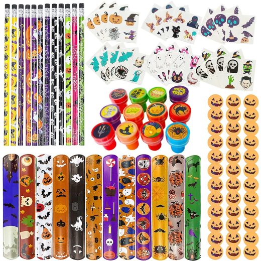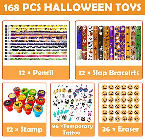 168 PCS Halloween Party Favors for Kids, Assorted Halloween Goodie Bag Fillers Stationery Set, Kids Halloween Toys Bulk Non Candy Halloween Treats Pencils, Eraser, Halloween Stamps, Temporary Tattoos, Slap Bracelets