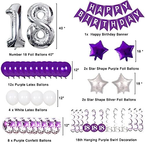 18th Birthday Decorations for Girls, Purple Happy 18 Birthday Decorations, HAPPY BIRTHDAY Banner Silver Number 18 Balloons, Purple Theme Party Supplies Kit for Girls Boys – 18 Years Old Birthday Party Decorations 18th Birthday Balloons for Her