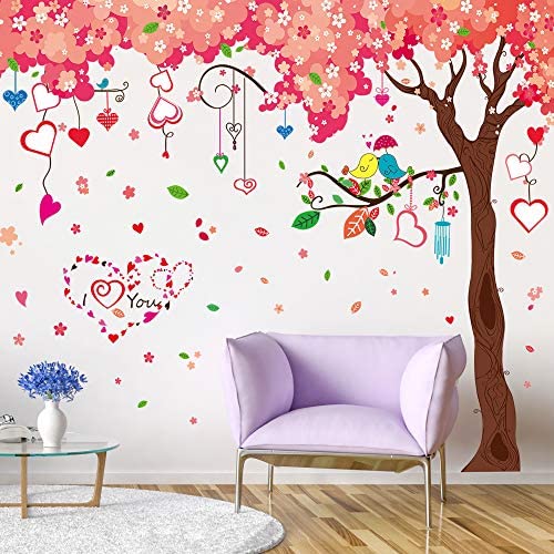 Amaonm Giant Huge Pink Cherry Tree Wall Decals Cute Cartoon Removable Large Tree Lovely Heart Shape Wall Sticker Peel Stick for Kids Girls Bedroom Livingroom TV Background