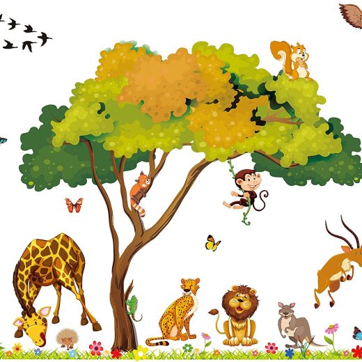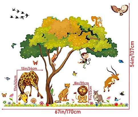 Amaonm Jungle Animal and Tree Wall Decals Removeable DIY Flower Lion Giraffe Owls Wall Sticker Peel and Stick Wall Decor for Nursery Kids Room Bedroom Living Room (D)