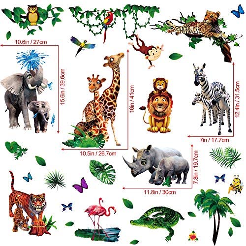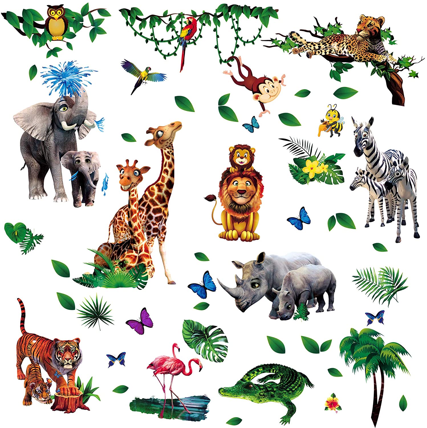 Amaonm Removable 3D Nature Wildlife Animals with Plants Green Leaves Tree Vine Wall Sticker Monkey Birds Leopard Peel and Stick Decor Wall Decals for Home Wall Kids Baby Bedroom Living Room Nursery