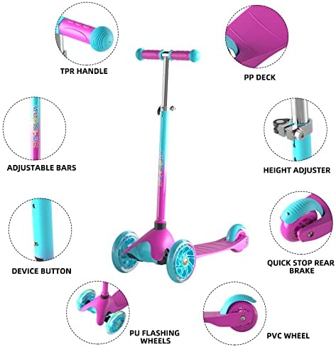 Scooters for Kids 3 Wheel Kick Scooter for Toddlers Girls Boys Scooter with Flash Wheels 4 Adjustable Height Lean to Steer Rear Brake for Children from 2 to 5 Years Old