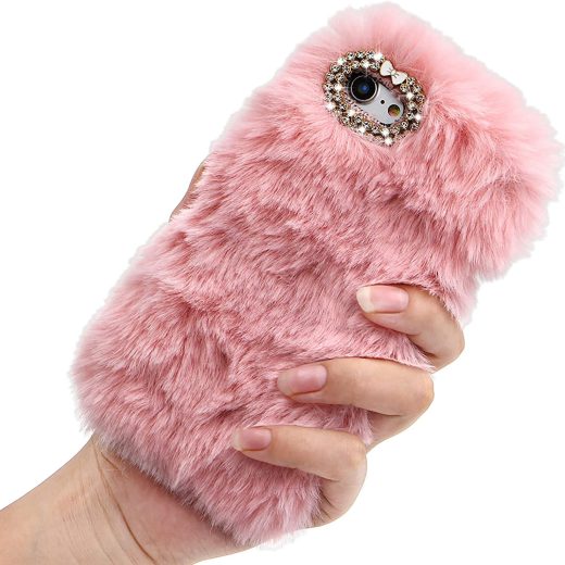 Rhinestone Fluffy Rabbit Fur Case for Samsung Galaxy S21 Plus 6.7 Inch, Girlyard Cute Bling Diamond Handmade Furry Winter Warm Fashion Faux Bunny Hair Plush Soft Phone Cover for Women Girls – Pink