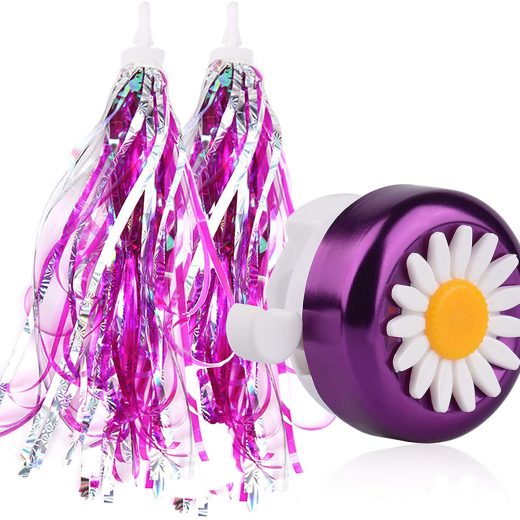 Kids Purple Streamers and Bike Bell for Girls-1 Pack Flower Bicycle Bell with 2 Pack Handlebar Streamers Scooter Tassels for Childrens Bike Accessories