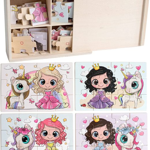 TOYLI 4-in-1 Princess Wooden Jigsaw Puzzles for Kids 48 PCs with a Box Preschool Educational Brain Activity Hand-Eye Coordination, Essential Skills Gift for Toddlers Children Girls Boys