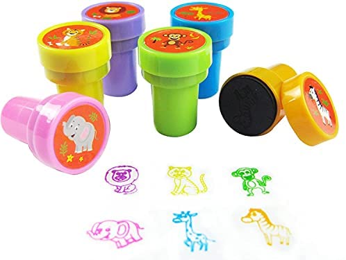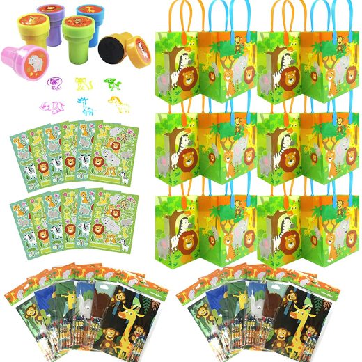TINYMILLS Safari Animals Jungle Book Birthday Party Assortment Favor Set of 108 pcs (12 Large Party Favor Treat Bags with Handles, 24 Self-Ink Stamps for Kids, 12 Sticker Sheets, 12 Coloring Books, 48 Crayons) Party Bundles for Birthday Party