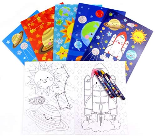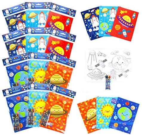TINYMILLS Outer Space Coloring Book for Kids Party Favor Set with 12 Coloring Books and 48 Crayons Space Astronaut Rocket Birthday Party Supplies Outer Space Party Favor Bag Fillers