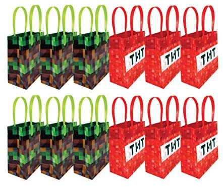 TINYMILLS Pixel Miner Party Favor Set of 60 Pcs (12 Party Favor Treat Goody Bags with Handles, 24 Self-Ink Stamps for Kids, 12 multi-point pencils, 12 small spiral notepads)