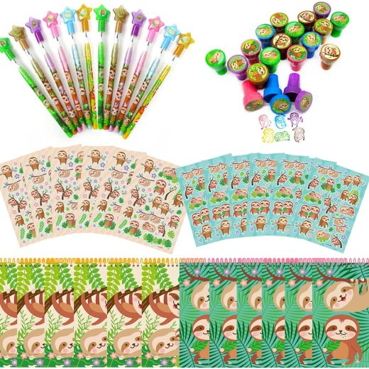 TINYMILLS Sloth Birthday Party Favor Set (12 multi-point pencils, 12 self-inking stampers, 12 sticker sheets, 12 small spiral notepads) Sloth Party Supplies Party Favor Stuffers Pinata Fillers