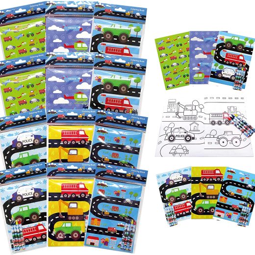 TINYMILLS Transportation Vehicles Trains and Construction Coloring Book for Kids Party Favor Set with 12 Coloring Books and 48 Crayons Birthday Party Supplies Cars Party Favor Bag Fillers