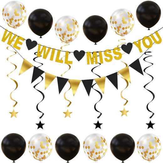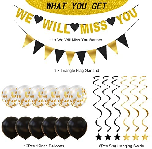 We Will Miss You Decorations Gold Glitter We Will Miss You Banner, Triangle Flag Garland, Star Hanging Swirls and Balloons for Office Leaving, Farewell, Goodbye, Going Away Party Decorations