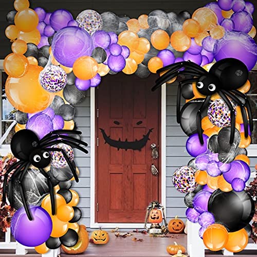 Wecepar Halloween Balloons Garland Arch Kit – 211 Pieces with Halloween Spider Web, Confetti Black, Orange, Purple Latex Balloons Spider Balloons for Halloween Day Party Decorations