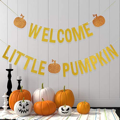 Welcome Little Pumpkin Banner Gold Glitter- Little Pumpkin Baby Shower Decorations,Fall Pumpkin 1st Birthday Decorations,Welcome Little Pumpkin Decorations