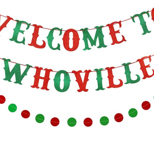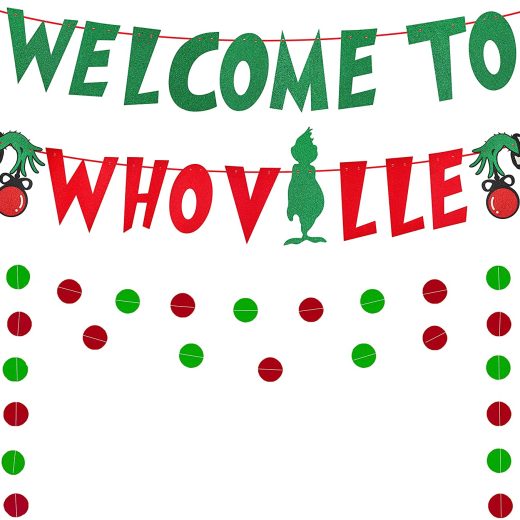 Welcome To Whoville Banner Red and Green Glitter, Whoville Christmas Decorations, Grinch Christmas Decorations, Merry Grinchmas Banner for Fireplace Mantle Home, Xmas Birthday Party Decorations, Christmas Vacation Holiday Decorations