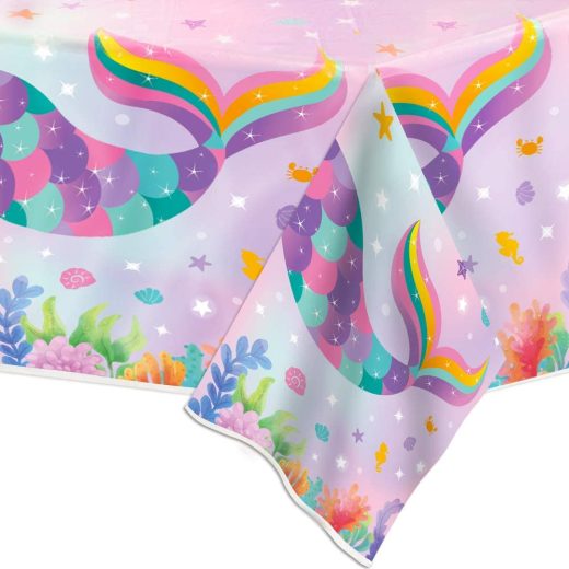 WERNNSAI Mermaid Table Cover – 108×54 Printed Plastic Tablecloth, Party Supplies for Kids Girls Birthday Pool Baby Shower Mermaid Themed Under The Sea Party Decoration