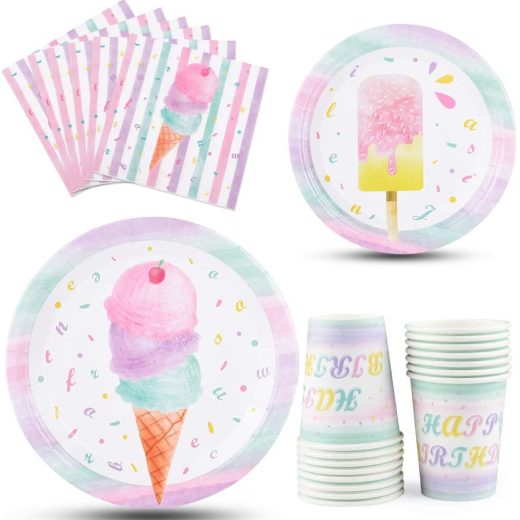 WERNNSAI Ice Cream Plates Napkins and Cups – Ice Cream and Popsicle Theme Party Supplies for Girls Birthday Disposable Tableware Dessert Plates Luncheon Napkins Serves 16 Guests 64PCS