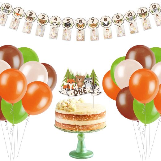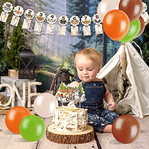 Woodland Animals 12 Months Photo Banner Cake Topper Balloon Set Forest Creatures First Year Monthly Milestone Picture Garland Latex Balloons for Baby Boy Girl Woodland Theme Party Supplies