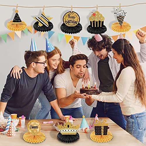 WOJOGO Birthday Honeycomb Centerpiece Table Decorations for Birthday Party, 8 Pieces Happy Birthday Honeycomb Table Decor Party Supplies (Black and Gold)