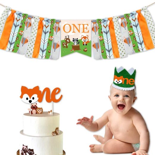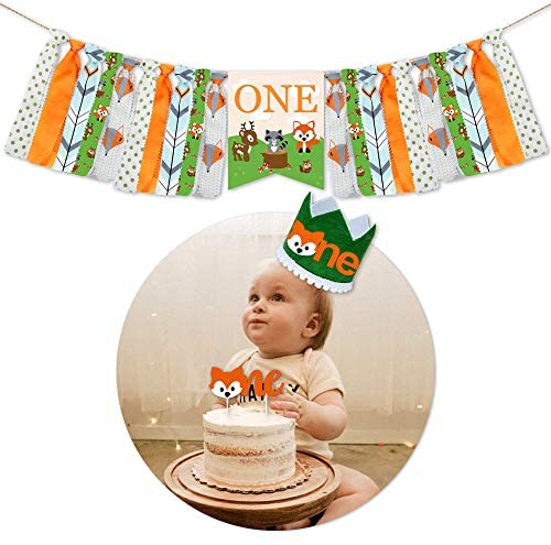 Woodland Animal 1st Birthday Decoration,Woodland Creatures High Chair Banner Baby First Birthday Crown Fox ONE Cake Toppers for Wild One Birthday Baby Shower Supplies