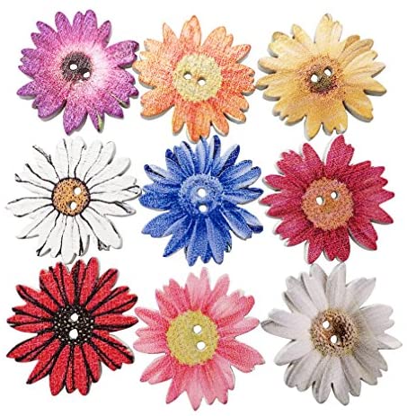 Wooden Buttons, Retro Flower-Shaped Pattern Decorative Button,Novelty Mixed Round 2 Holes Buttons Pack of 50(Multicolored-Flower)