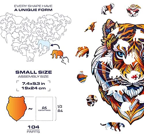 UNIDRAGON Wooden Jigsaw Puzzle, Best Gift for Adults and Kids, Unique Shape Jigsaw Pieces Lovely Tiger, 7.4 x 9.3 in (19 x 24 cm) 104 pcs, Small
