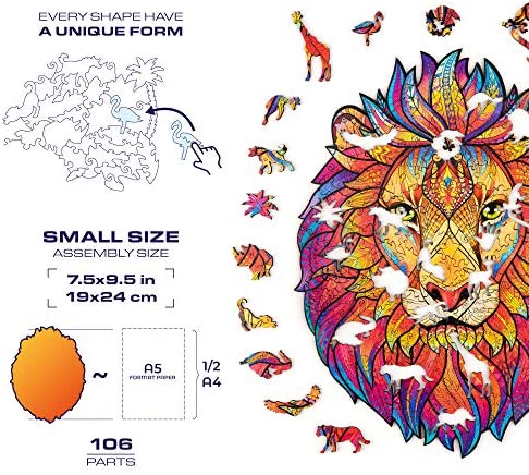 UNIDRAGON Wooden Jigsaw Puzzle, Best Gift for Adults and Kids, Unique Shape Jigsaw Pieces Mysterious Lion, 7.5 x 9.5 in (19 x 24 cm) 106 pcs, Small