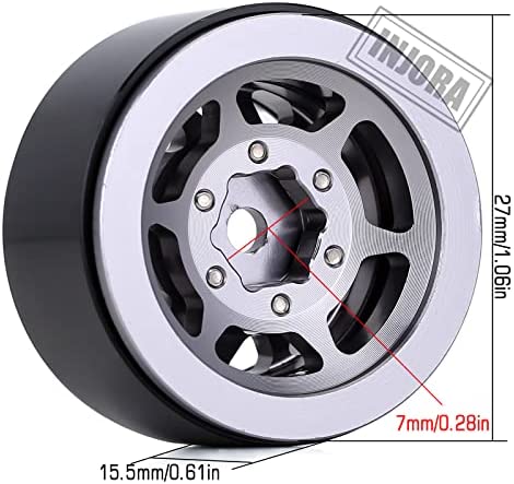 Features: CNC machined and aluminum anodized finish, durable and wear-resistant Beadlock design, dont need to glue, easy to install Eight colors to choice, you can change the color for your rc car The perfect scx24 wheel, enhances overall performance in handling 1.0 beadlock wheels Suit for RC Crawler Axial SCX24 or other mini/micro crawler Specifications: Material: Aluminum alloy Quantity: 4PCS Weight: 15g/pcs (0.53oz/pcs) Color:Black&Grey Outer Diameter: 27mm / 1.06in Width: 15.5mm / 0.61in Wheel Hub: 7mm / 0.28in Suit for: RC Crawler Axial SCX24 or other mini/micro crawler. Package List: 4 * RC Car 1.0 Wheel Rim