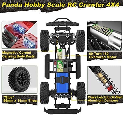 Hobby RC Crawlers Gifts & 2.4GHz Non-interference TransmitterWith Upgraded Performance, you can find a bunch of rc crawler accessories and upgraded parts from PANDA HOBBY RC.Non-interference radio remote control has full-function proportional controls. Realistic looking scale body style – including windshield wiper blades,LED bar, front and rear light buckets, door handles, rock rails, grill insert ,reverse cowl induction on the hood.It is also a perfect gifts for adults kids.