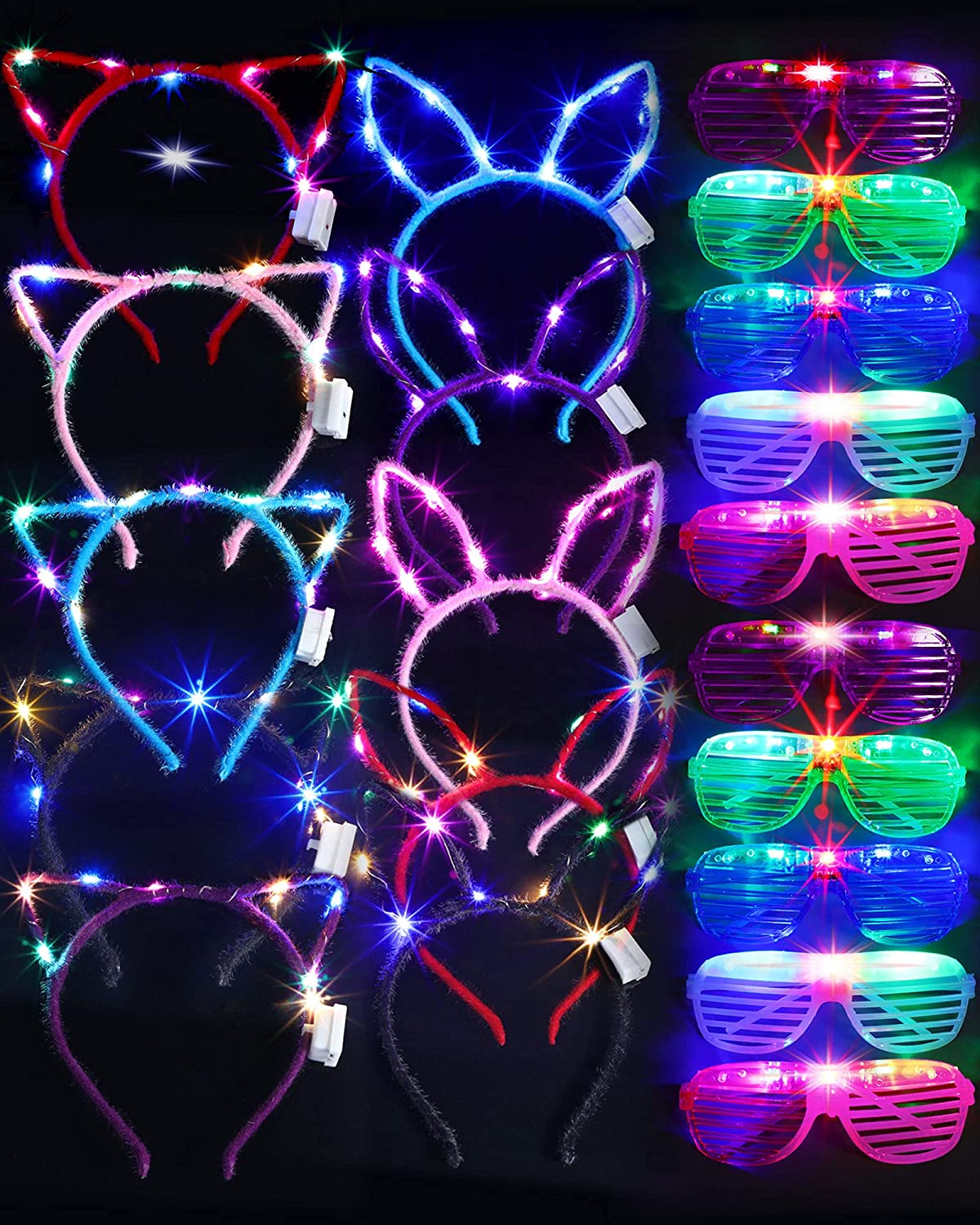 10 Pcs LED Light Up Glasses 5 Pcs LED Cat Ear Headband 5 Pcs Rabbit Ear Headband, 5 Colors Mardi Gras Glow Sunglasses 2022 Glow in The Dark Party Supplies Neon Party Favors Wedding
