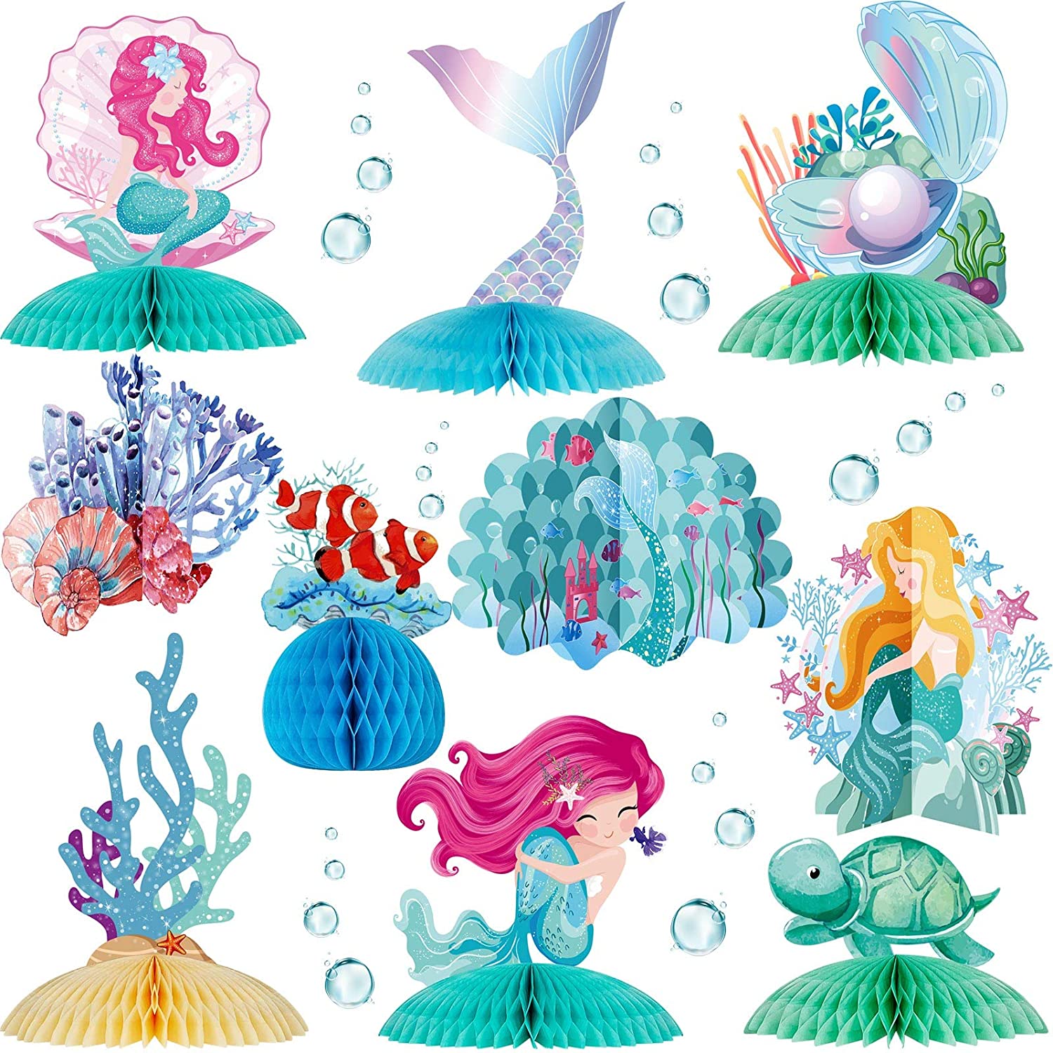 Mermaid theme party supplies set: you will receive 10 pieces mermaid centerpieces in this package, including 7 pieces of honeycombs centerpieces in different patterns, and 3 pieces of mermaid theme standing cards, our mermaid party supplies is all that you need to transform your place into a happy little mermaid party paradise Durable material: mermaid theme table centerpieces and mermaid theme cards are made of paper which is durable for long time use, double-side printed, not easy to fade, easy to store and fold Cute design: mermaid theme honeycombs centerpieces and standing cards include 10 unique design in three different little mermaid shapes that coordinate with the mermaids party theme; In addition to mermaids, our products have other marine, such as seashells with pearl, sea grass, coral, mermaid tail, sea turtle, fish; The unique design makes these mermaid party decorations a fun addition to any baby shower or birthday party Convenient to use: what you need to do is to open the these honeycomb centerpieces and they will easily form in shape, save your time and effort, three-dimensional and lovely, honeycomb centerpieces are easy to open and close Wide occasions: these mermaid ocean themed ornaments are ideal decorations for mermaid birthday party, girls birthday party, baby shower, under the sea party, mermaid theme party or birthday celebration.etc.; They will greatly enhance the party atmosphere and provide a good decoration effect