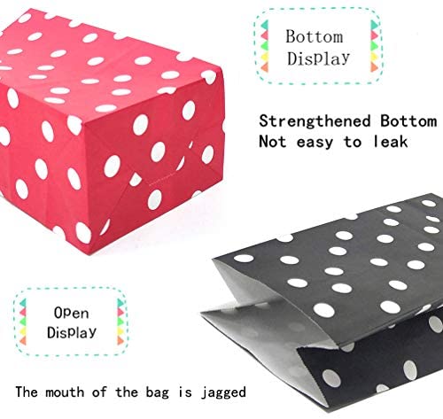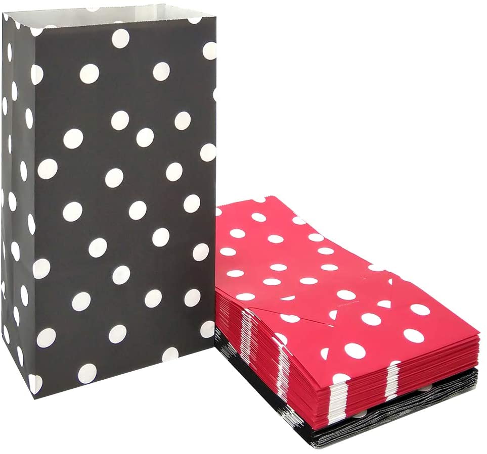 MATERIAL – Small paper bags are made of high quality colored kraft paper YOU WILL GET – 100 CT black and red paper bags including 50 PCS red and 50 PCS black, 5.1 x 3.1 x 9.4 inches red and black polka dot gift bags USE – Red and black goody bags are easy to carry/store candy treats, small toys, cookie, bread, fruits and more food APPLICATION – The combination of red and black polka dot favor bags are perfect for Mickey-themed parties. It also ideal for kids’ birthday party, baby shower, wedding, bachelorette party, candy party or holidays and give out memorable small gifts to your guests GOOD SERVICE – We value every evaluation you give. If you are not satisfied with our red and black party bags or services,please feel free to contact us , we will try our best to provide you with a perfect solution