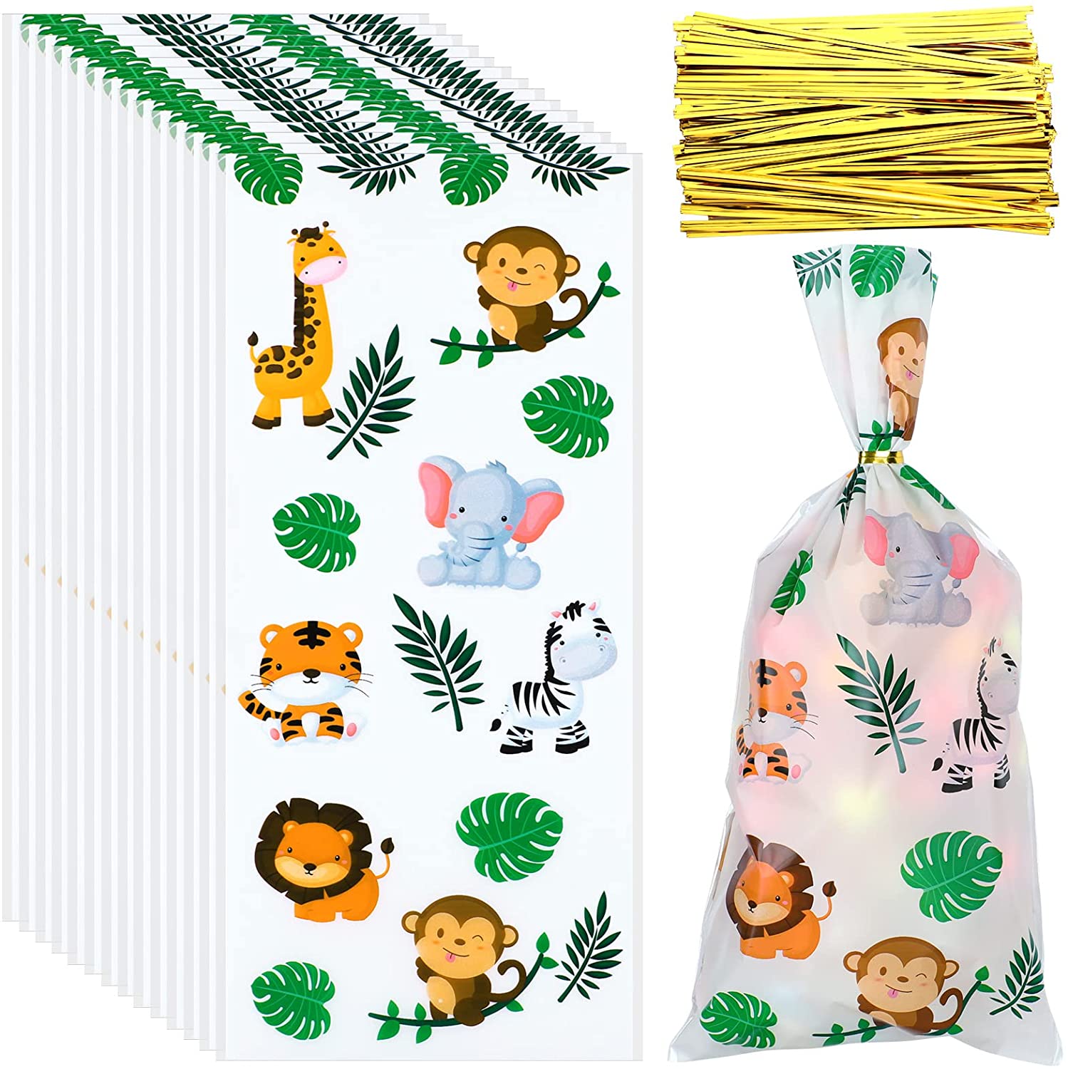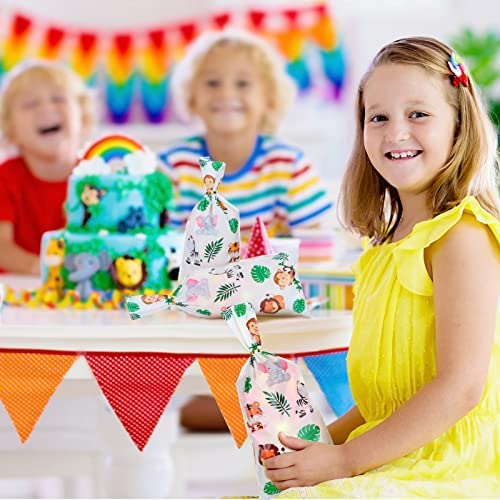 100 Pcs Jungle Animal Party Favors Bags Safari Animal Plastic Goody Treat Bags Safari Jungle Cellophane Gift Bags with Ribbons for Baby Shower Favors Jungle Theme Party Supplies for Birthday Party