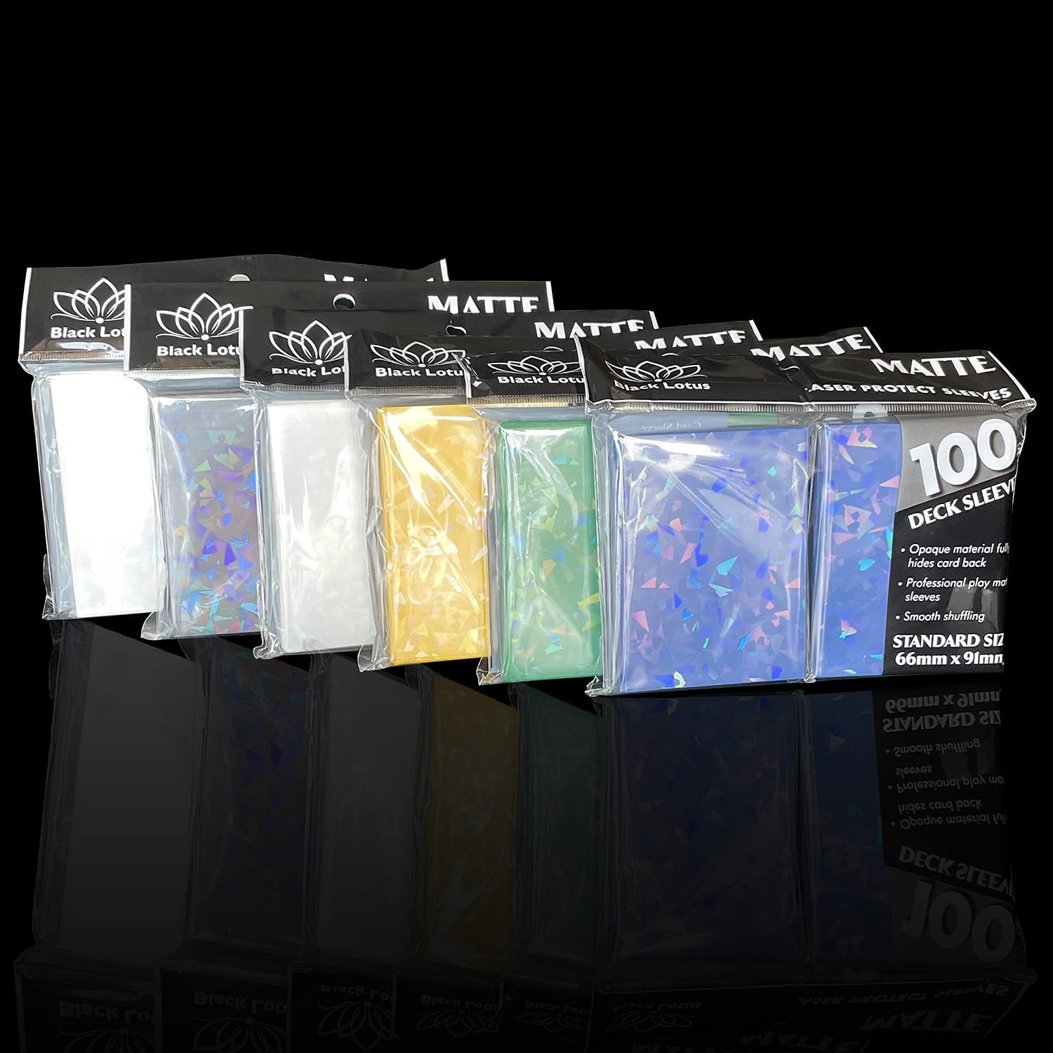 The sleeves have gemstone holographic front, Color Matte back, 0.1mm thickness, very durable.