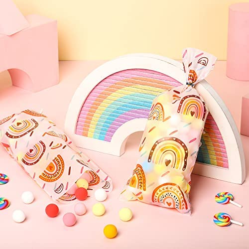 100 Pieces Boho Rainbow Cellophane Bags Boho Rainbow Candy Bags Rainbow Party Favor Bags Goodie Bags Treat Bags with 150 Pieces Silver Twist Ties for Boho Rainbow Themed Birthday Party Bags
