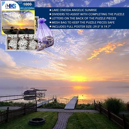Fun For Everyone – Our Jigsaw puzzles for adults come with 1000 pieces along with a poster and cardboard box separator to help you challenge your problem solving and critical thinking skills or simply have fun together with the whole family WHATS INCLUDED – This jigsaw puzzles for adults come in high quality puzzle pieces in a reusable purple mesh bag. 1x puzzle poster of the exact dimension of the puzzle, 1x Cardboard box separators that allow you to sort pieces within the box by edges, colors, etc. Each piece is 1.75mm thick and measures 29.5 x 19.7 inch when assembled. From the moment you hold a BHKS puzzle box in your hands, you’ll feel the difference. Safe And Sturdy Materials – BHKS 1000 piece puzzles are made using soy-based inks and recycled cardboard to make sure they are colorful and sturdy. The jigsaw puzzle pieces are precision cut to slide into place smoothly and won’t easily bend and the puzzle is fully interlocking. Multi-Use – Jigsaw Puzzles: BHKS jigsaw puzzles will improve hand-eye coordination and develop problem-solving skills, logical thinking and patience ability; A great way to connect with family members and friends to develop a closer relationship; A great Meditation tool and stress reliever.This hard jigsaw puzzles 1000 pieces for adults have the letters printed on the back in a grid to help with putting it together. US BASED COMPANY.- We pride ourselves in being a American born and bred company based in NJ. We import only the highest quality materials for our puzzles. We combine bright colors with a soothing design to bring you jigsaw puzzles 1000 pieces for adults that will add a decorative touch to your space. It features Lake Oneida with an Early Morning Angelic Sunrise to brighten up your space.