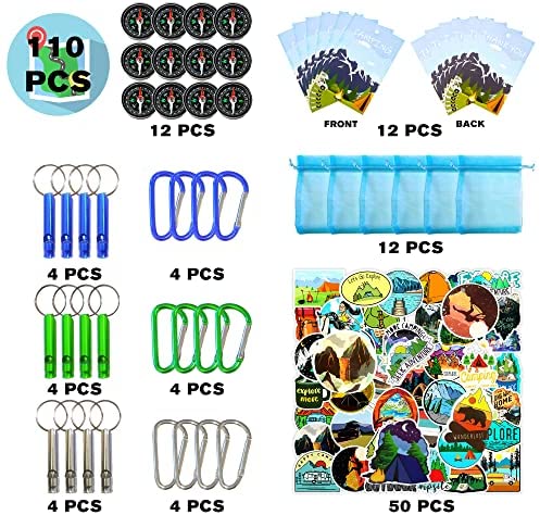 110PCS Camping Happy Birthday Party Favors Gift Bag Kits with Camp Compass, Hiking Whistles Keychain Carabiner, Camping Stickers Decorations for Outdoor Camper Nature Adventure Exploration Supplies