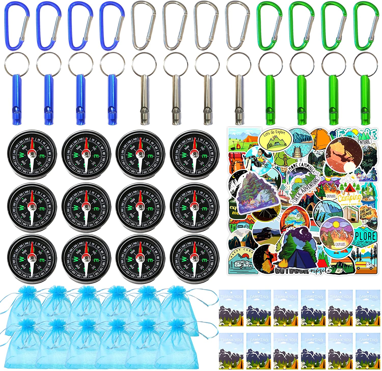 MATERIAL: Plastic, aluminum alloy, paper, organza. PACKAGE: A total of 110pcs camping happy birthday party favors gift, including: 12pcs Mini compass toys, 12pcs Aluminum alloy whistle (4pcs green, 4pcs silver, 4pcs blue), 12pcs Carabiner (4pcs green, 4pcs silver, 4pcs blue), 12pcs Camping cards, 12pcs Lake blue organza bag, 50pcs Camping Stickers. SIZE: The specific dimensions of camping happy birthday party favors gift set are shown in the picture. EASY TO USE: You can buckle the carabiner on the whistle, or you can use it alone in other places. Put small gifts such as whistle and compass in the organza bag. The carefully designed card will make your friends or family members fall in love with this event. NOTICE: 1.Age grading: 3 Years And Up. 2.Since our product is manually measured, there may be a slight error. 3.Due to differences between monitor displays, actual color may be slightly different from picture.