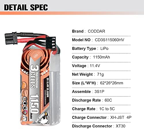 1150mAh 3S 11.4V 50C HV LiPo Battery with XT30 Connector for RC Racing Drone FPV Quads Quadcoper