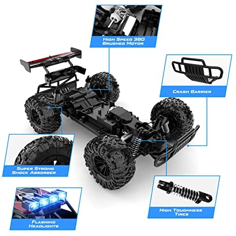 1:16 Realistic Scale High Speed RC CarsThe remote control truck is equipped with a fast brushed RC 380 motor, which can produce more horsepower for the RC cars. RC truck can go up to 33Km/h at full speed with the powerful built-in motor. Make operators in marvelous enjoyment.