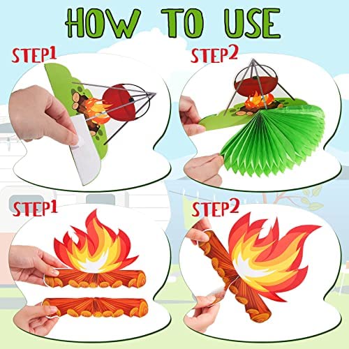 Features: Rich patterns: These table decorations cater to the camping theme, featuring various camping patterns, such as the compass, backpack, flashlight, bear, campfire, and more, can easily create a camping scene. Saving your time: No tools required, you can easily assemble these paper centerpieces by yourself in a minute, saving your time and effort. Specifications: Material: paper Color: as shown in pictures Size: as shown in pictures Package includes: 8 x Camping theme honeycomb centerpieces 4 x Camping theme 3D standing cards Notes: Please allow slight color difference due to different screen displays. Please allow slight errors on size due to manual measurement.