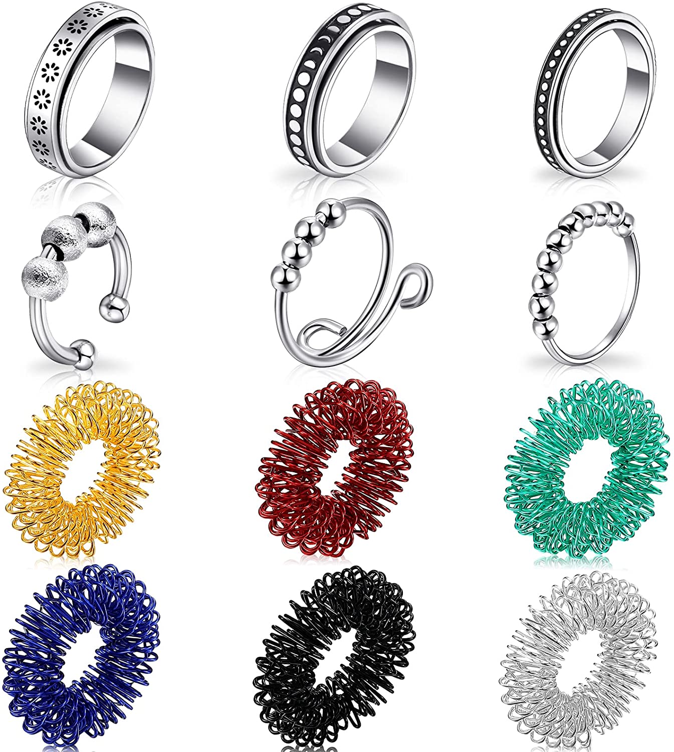 12 Pieces Fidget Anxiety Rings Including 6 Pieces Spiky Sensory Finger Rings, Spinner Rings, Anxiety Rings, Zircon Ring with Beads for Women Men (Multiple Style)
