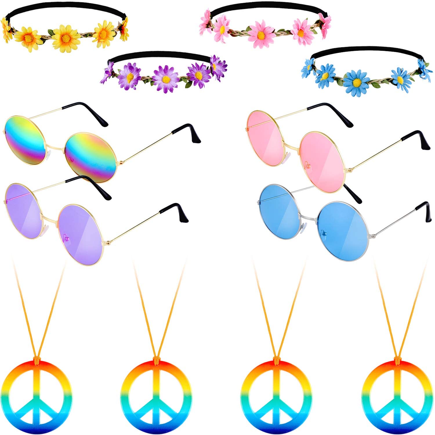 12 Pieces Hippie Dressing Accessory Set Includes 4 Pairs 60s 70s Style Circle Colored Glasses 4 Pieces Sunflower Crown Headband 4 Pieces Rainbow Peace Necklace for 60s 70s Party Favor
