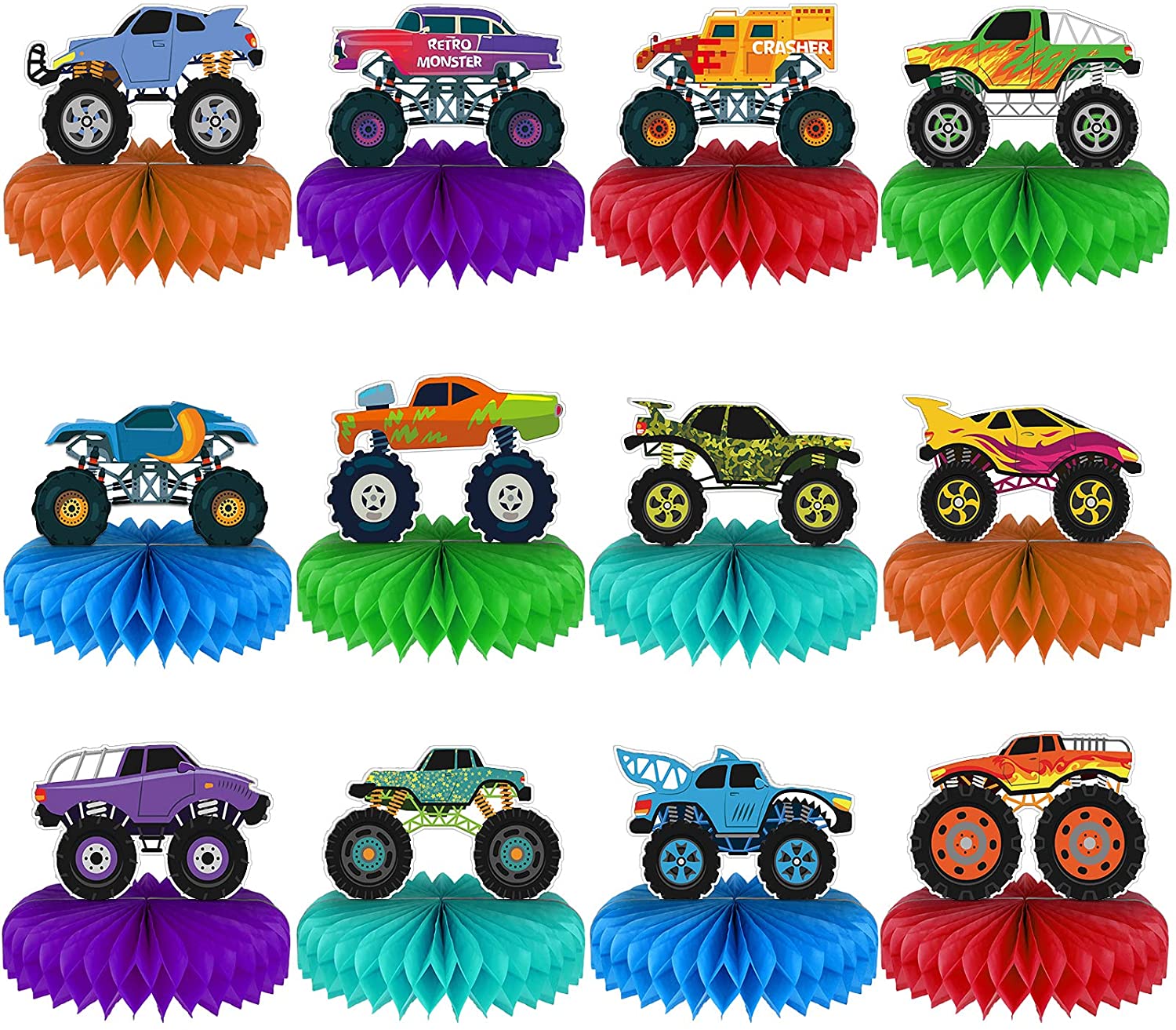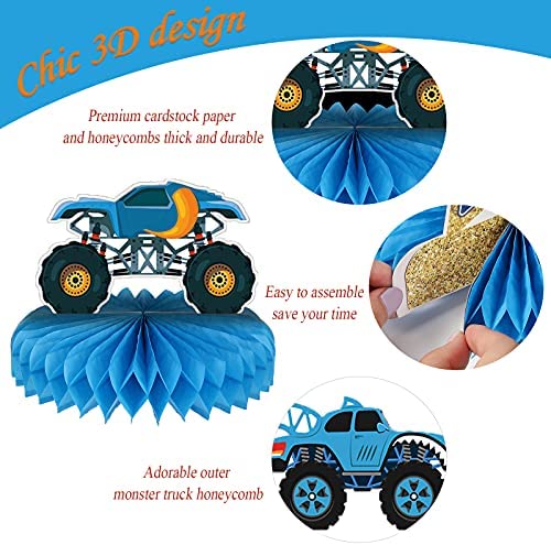 12 Pieces Monster Truck Decorations vehicle Themed Centerpieces for Tables Decorations 3D Monster Truck Car Theme Honeycomb Table Topper for Boys Girls Kids Transportation Birthday Baby Shower Party Supplies Features: How to use: 1.Tear off the sticker of the honeycomb ball. 2. Stick the honeycomb ball to a fixed area on the card. 3. Repeat on the other side of the card. 4. Put it stand on the table. Specification: Material: card stock with surface laminated Size: approx 6 x 6 inches Color: as pictures shown Package included: 12 x monster truck honeycomb centerpieces