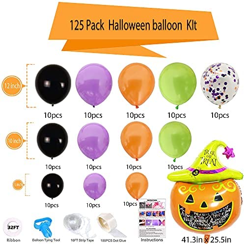 Value Pack126pcs halloween balloon arch kit including 30pcs orange balloons, 30pcs black balloons, 30pcs purple balloons, 20pcs green balloons, 10pcs confetti balloons and 1pcs giant pumpkin balloon. 32ft balloon ribbon, 16ft balloon strip tape, balloon tying tool, 100pcs dot glue and instructions, one pack meet all your halloween party decorations need! Premium MaterialHalloween balloons garland was made of 100% natrual latex, thick and durable, safe to be used for children. Can be filled with air or helium. Halloween Party DecorThis halloween party balloons set is perfect for halloween party decorations, hallooween party supplies, kids hallooween party favors, halloween birthday party decorations, halloween bachelorette party decorations, pumpkin first birthday decorations, etc. Easy To AssembleWe offer four tools including ribbon, strip tape, tying tools, dot glue and instructions to help you make balloon arch garland kit more easily. When you arrange such a halloween decorations party with your family, it will be an unforgettable memory! 90 DAY AFTER-SALE SERVICE : At There for You, our #1 priority is bring happiness to our guest! If you have any quality problems with our products, please contact us!