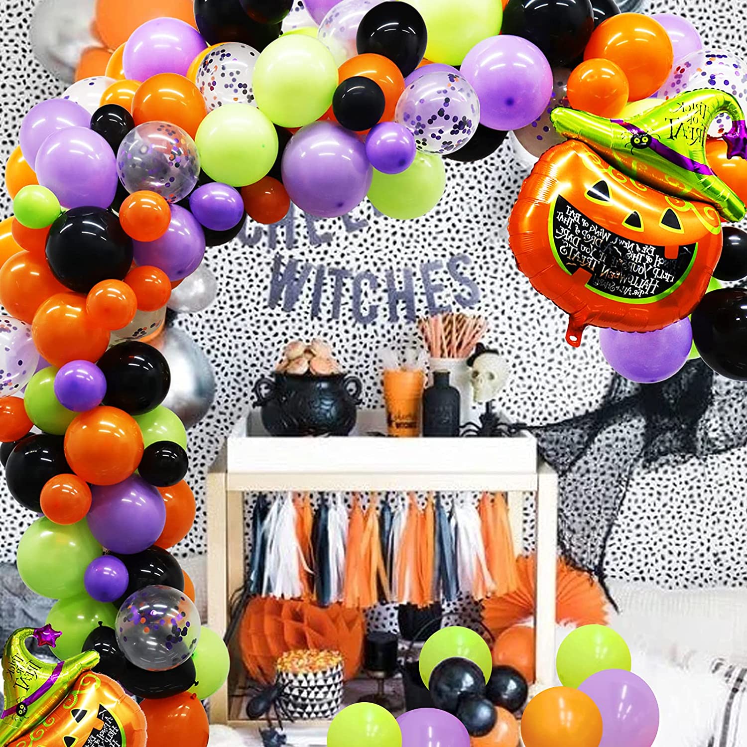 126 Pack Halloween Balloon Arch Garland Kit, Black Orange Green Purple Confetti Balloons and Mylar Pumpkin Balloon for Kids Halloween Birthday Party Decorations Supplies