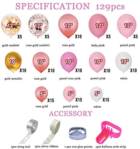 Occasion Bridal Shower, Wedding, Baby Shower, Birthday Color Pink Included Components Tying Tool, Glue, Balloon Arch Material Paper, Plastic, Rubber Unit Count 129.00 count Ouddy CPSIA Cautionary Statement Choking Hazard – Balloon