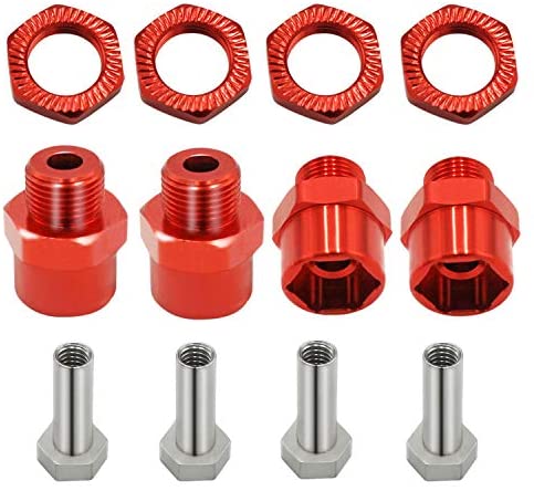 Specifications: Material: Aluminum Alloy Total length: 23mm Offset:15mm Hex depth: 5mm Axle thread: M4 Weight: 50g Package Includes: 4 x wheel adapters 4 x wheel nuts 4 x M4 axle hub nuts NOTE: these are not suitable for 2WD models using bearings instead of 12mm hex hubs.
